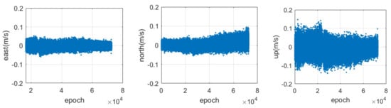 The time series of the velocity estimation error in the three components are shown in Figure 9, where the true value is considered to be zero. Similar to the result of the positioning error, it shows a high accuracy in the east-west component due to the distribution of the current CAPS constellation, followed by the north-south and vertical components. The RMS of the velocity estimation is illustrated in Table 2, and we are able to determine that the level of accuracy can reach about 1.35, 1.70 and 3.23 cm/s in the east-west, north-south and vertical components, respectively.