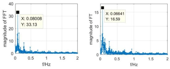 It can be seen from Figure 10 and Figure 11 that the position result shows some periodic feature, while the post-processing result doesn’t. A spectral analysis of the east positioning error in static and dynamic modes with FFT was shown in Figure 12. The largest magnitude was located at 0.08 Hz in static mode, which means a period of about 12.5 s. A similar result was obtained from the positioning errors of other components. In dynamic mode, the largest magnitude was located at 0.066 Hz, which means a period of about 15 s. The reason for this may lie in the error model of the corrections, in the truncation error or in the errors related to the time delay of the broadcast. The specific reasons still need further analysis and more experiments. We can infer that the positioning accuracy would be improved once this problem was solved.