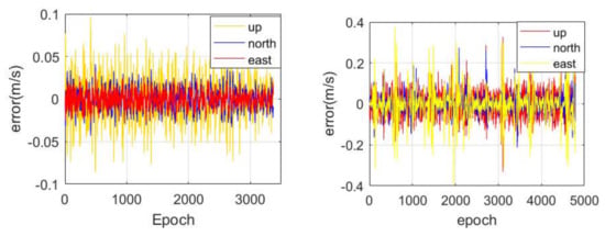 The error of the velocity estimation based on CAPS in static (left) and kinematic (right) modes with a sampling rate of 4 Hz.