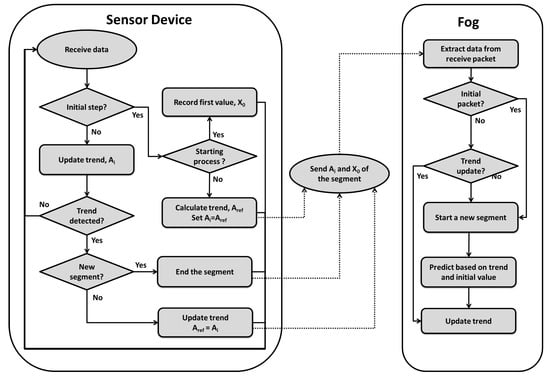 By the end of the initial phase, the sensor device, sends the initial model parameters, , the first value of the first segment and starting time point to the fog node. The process of the sensor device in the initialization phase is presented in Algorithm 1.