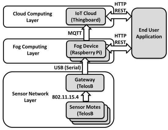 The hardware we used in the wireless sensor network layer was TelosB [] motes with an IEEE 802.15.4 complaint transceiver, CC2420 [] and CSMA/CA medium access control protocol, running the Contiki [] operating system. The fog computing layer was created using Raspberry Pi model B+ hardware, running the Raspbian operating system version 9. The program running on the Raspberry Pi was written in Java 7, and when the getaway mote was connected to the Raspberry Pi, it created a virtual serial port at 115,200 baudrate, which is used by the Java program to communicate between the gateway mote and the Raspberry Pi. The Raspberry Pi was then connected to a local gigabit Ethernet network created by a Linksys WRT1200AC network router. The cloud computing layer was realized using regular desktop computer hardware, also connected to the Linksys WRT1200AC router. Hence, a Dell Optiplex 780 with a 2.93 GHz Intel Core 2 Duo processor and 4 GB of RAM was used as the cloud machine, running Ubuntu version 16.04 LTS and ThingsBoard 1.3.1. A laptop was also used for some of the measurements. This laptop was a HP Elitebook 1040 G3, with an Intel I7 2.5 GHz processor and 8 GB RAM, connected to the same Ethernet network provided by the Linksys WRT1200AC router.