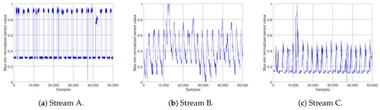 The original sensor data streams. The sampling rate varies for each of the data streams; (a) Stream A 100 ms, (b) Stream B 500 ms, and (c) Stream C 200 ms.