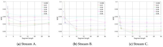 According to the model explained in Section 3, two parameters of trend threshold and maximum number of data points in each segment, as well as segment length m, have the highest effect on the model performance. The reason is that they indicate the level of trade off between energy efficiency, with respect to transmission reduction, and sensitivity of the model in trend and change detection, which has a direct effect on the accuracy of the simulated data stream at the fog node. Several experiments with various values of and m for each of the data streams were conducted, to investigate these effects on simulation accuracy at the fog node in terms of mean square error, and to choose the most appropriate set of parameters for the model. Figure 5 presents the results. As can be seen from the graphs, the mean error of the simulated data streams at the fog node has the sharpest decline for all sets of parameters, when the simulations were based on statistical information from two data points, . From this point on the results of each of the data streams show different patterns; nonetheless, the best parameter set for all of the data streams, with respect to the MSE, was achieved by , see Figure 5a–c. At this point for almost all sets of parameters, the trend reversed and has raised steadily. The complete results are summarized in Table 1.
