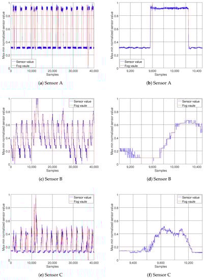 Comparisons between normalized sensor data (blue) and the simulated sensor stream (red). The left column (a,c,e), shows the performance of the proposed method for the duration of the experiment (40,000 samples) on different streams. To illustrate the results in more detail, the right column (b,d,f), shows a zoomed in view of a shorter interval (1200 samples on the same streams).