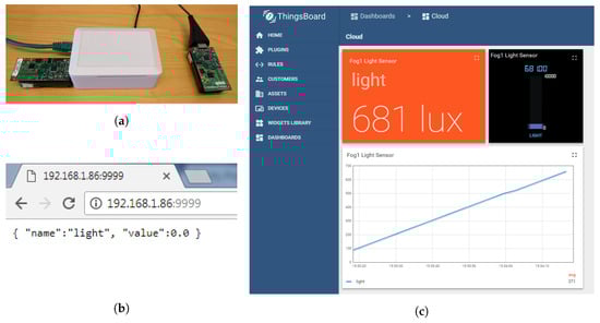 The testbed experimental setup: (a) Sensor motes and fog node with attached sensor gateway; (b) REST interface, running on fog node, in a regular web browser; (c) Cloud dashboard with regenerated sensor values by the proposed model.