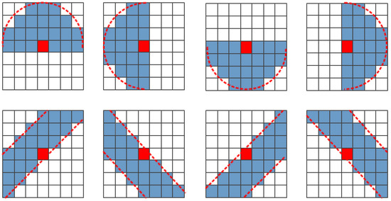 17]. To come up with this method, three basic principles were taken into account as follows: (1) all the elements in the covariance or coherency matrix have to be filtered independently in the spatial domain to avoid cross-talk; (2) each term of the covariance or coherency matrix should be filtered in the same edge-aligned window, which is similar to multi-look processing, to preserve polarimetric properties; and (3) the filter is self-adaptive to weight the covariance or coherency matrix of the center pixel with the mean value from selected neighboring pixels. This principle is to preserve point targets, as well as speckle elimination. Though the three principles are considered, the capability of keeping the edge sharpness is very limited in the heterogeneous regions, such as the streets, the city blocks, the bright point scatterers, etc. The streets always show linear features and the single point scatterers cambered features. While all the windows in Refined Lee filter still have the square brims. That is to say the edge-aligned windows of the Refined Lee filter do not match very well to the edge signature when the scene becomes complicated.