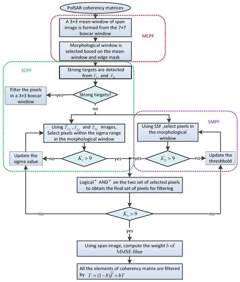 21], the improved sigma filter was extended to polarimetric SAR imagery. In the procedure, the speckle filtering was applied only to distribution media, and the strong targets were leaved unfiltered. The estimation of priori mean and sigma range were using the pixels selected by all the three polarizations corresponding to the specular, double bounce and volume scattering mechanisms. This implementation was addressed to account for the preservation of scattering mechanisms. Whatever estimations by the coherency or covariance matrix are carried out, the polarimetric properties are only from the diagonal elements of the matrix. The off-diagonal elements from the matrix do not contribute so much to the polarimetric information preservation.