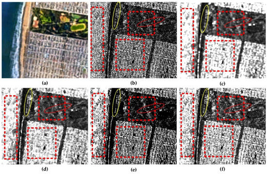 43], which considers the region heterogeneity. Good texture preservation can be obtained only if the coefficient of variation estimated for the filtered image by means of spatial averages is close to the value expected for the original image. The three parameters are tested mainly on three areas for different filtering results, which are enclosed by the red dash boxes in the ocean area, the vegetation area and the building area, respectively. The parameter values are listed as