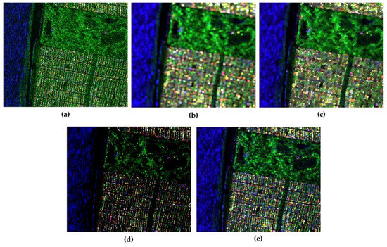 Figure 6a, we can see that the scattering mechanism is badly impaired by the speckle noise, so that the city blocks show a strong performance of volume scattering, which is unfit for its rational surface scattering characteristics. The same impact is on the racecourse in the vegetation area, which is specular return for the scattering mechanism. For comparison, we still use boxcar filter, the Refined Lee filter, the nonlocal filter and JRPF to mitigate the speckle noise. The boxcar is in 7 × 7, the Refined Lee filter in 7 × 7, the nonlocal filter in 7 × 7 (with 21 × 21 searching window) and JRPF in 7 × 7. All the filtering results show reasonable good filtering characteristics of reducing speckle noise and preserving scattering mechanisms.
