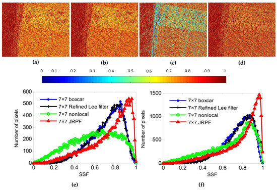 Figure 7e,f, respectively. Among the color, blue represents the statistical curve filtered by 7 × 7 boxcar, black represents by 7 × 7 refined Lee filter, green represents by 7 × 7 nonlocal, and the red color is filtered under 7 × 7 JRPF. From all the statistical results, it can be seen that the SSF curves of the 7 × 7 boxcar and black 7 × 7 refined Lee filter are almost in superposition and their peaks are around 0.8 in vegetation area. The curve of nonlocal does not have an obvious peak with the low SSF in this area. Whereas, the peak of JPRF is near to 0.9, which shows that the new method can maintain the polarization scattering characteristics better. Similarly, the SSF in the building area are selected for statistics, and peaks of SSF curves of the other three filtering methods comparative to JPRF are around 0.88. The peak of SSF curves after filtering by JPRF is close to 0.97. In other words, the speckle filtering method of JPRF can almost maintain the polarization identically with its original one in the building area.