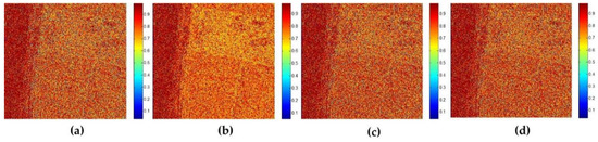 Figure 7 shows the polarization similarity measurement after different polarimetric speckle filtering methods. The results are obtained according to the SSF of coherency before and after filtering. It can be seen that, from