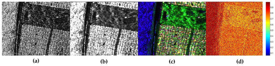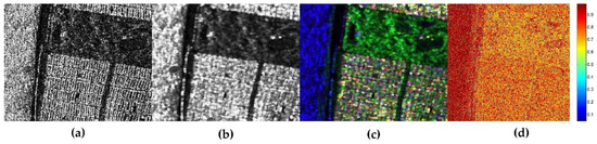 Figure 10a shows blur especially in the creek path. For the combination of MCPF and SCPF, the ENL value decreases a little, whereas the EPI increases. Furthermore, JRPF has a lower value of ENL and higher value of EPI than the combination results of MCPF and SCPF. Also, the two values in the combination of MCPF and SCPF are very close to the values in the JRPF. Accordingly, we can only conclude that it is very efficiency in speckle reduction for the combination of SCPF and SMPF, while the JRPF has a better result than the other three filtering forms for edge preservation in the vegetation area. As for the building area, the values of ENL in the four filtering forms are much lower than the corresponding results in vegetation area, and the values of EPI are a bit higher except for the combination of MCPF and SMPF. Amazingly, the ENL value and the EPI value are in the same trend in building area excluding the value of MCPF and SMPF. Though the ENL value is highest for combination of MCPF and SMPF, the EPI is the lowest amongst the four filtering forms. Whereas, the EPI value of JRPF is highest with an acceptable value of ENL. Moreover, the results for the combination of MCPF and SCPF are very similar to the values of JRPF. Considering abundant texture, we believe that JRPF keep a better performance than the others. In the ocean area, the value s of ENL and EPI are close to the values in vegetation area and the tendency is the same except for the combination of MCPF and SMPF. With a highest value of ENL and lowest EPI, we may think that this combination is a better strategy for filtering when only consider about the performance for ocean area. As a matter of fact, when talking about the speckle filtering, we may concern more about the vegetation area and city blocks which include more scattering information. In terms of the speckle reduction and the edge preservation for the whole image, the filtering method of combination of MCPF and SCPF seems to be capable of substituting the JRPF. Nevertheless, the scattering mechanism preservation should be also taken into consideration in the speckle filtering. For comparison, the SSF of filtering results by different combination of the three principles are shown in
