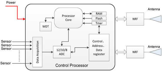 To facilitate on-board application, careful consideration needs to be taken regarding reliability and low power consumption. In our design, each node consists of one control processor and two RF circuits (RFICs). As a mature commercial circuit, an 8051 series microprocessor from Cygnal (Austin, TX, USA) is adopted as the control processor. Another chip from Texas Instruments (TI) (Dallas, TX, USA) is chosen as the data transceiver, which supports three types of modulation, FSK, MSK and GFSK. The chip supports configurable Clear Channel Assessment-Energy Detect (CCA-ED). This provides the possibility of using contention-based MAC protocol design. In addition, the microprocessor has been verified on-orbit by the Chinese satellite Shiyan-3 and functioned well [35]. The structure of the wireless node is illustrated in Figure 3 below.