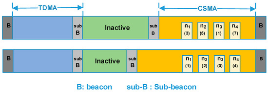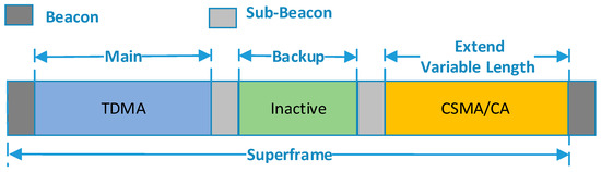 The main communication phase provides center scheduled slots which are assigned by the nodes’ ID. Nodes in type A and type B will communicate in this period. By contrast, the extended communication phase provides contention-based slots, in which an improved slotted CSMA/CA strategy is performed and nodes in type C will transmit their packet in this period. Due to the orbital characteristics, the on-board applications are periodic, thus we assume the number of the active nodes changes periodically too. Since the available power of a satellite is limited, a fixed-length superframe with a variable-length CSMA period was adopted. Accordingly, a variable-length inactive period is applied to the back-up communication period. In the inactive period, all nodes turn off their radio to conserve energy. Two sub-beacons are broadcasted by the host node to mark the boundary between adjacent periods. The structure of the superframe is shown in Figure 4.