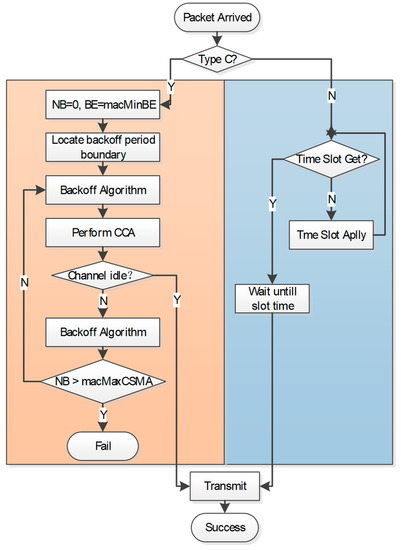 Meanwhile, during the Extended Communication period, a slotted CSMA/CA based mechanism is employed. Nodes in type C receive their slots with a contention access mechanism, and their data transmission only performs in ECP. For a particular node, the packet transmission process is shown in Figure 6.