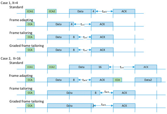 Note that when x is larger than 8, the new packet tail will extend to the next backoff unit. Also, assuming that the length of the valid data packet is randomly distributed, the ideal value of N is zero in order to reduce the invalid bytes. Besides, in CCA-ED mechanism, the channel energy checking last for eight symbols, here we assume that for energy detect, at least two symbol of data transmitting are necessary to ensure that the channel is assessed busy. Then the value of N is set to 2. The access processes of the standard strategy and the three improved strategies are shown in Figure 7.