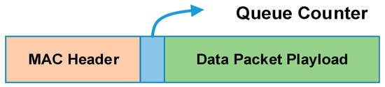 As shown in Figure 8, in order to gather the traffic status, a queue counter is added at the beginning of the data payload. For a slave node, the queue counter carries the number of the data packets in its buffer zone. With the queue information carried by data packets, the host node can calculate the real-time network traffic. Also, in the host node, an array is maintained to store the slot allocation in the TDMA period, in which M represents the number of the slots and N the nodes. The value of (1 < m < M, 1 < n < N) represents the slot occupation status. If the slot m is occupied by nodes n, then the value of will be 1, otherwise it will be 0. Obviously, the sum of the elements value in the array will be less than or equal to M. By checking array F, the slot that vacated by the sleeping node is known to the host node. In this section, an adaptive slot allocation method is proposed, which includes two basic strategies. It is designed such to mantian good performance under different traffic load. The strategies are described as follows.