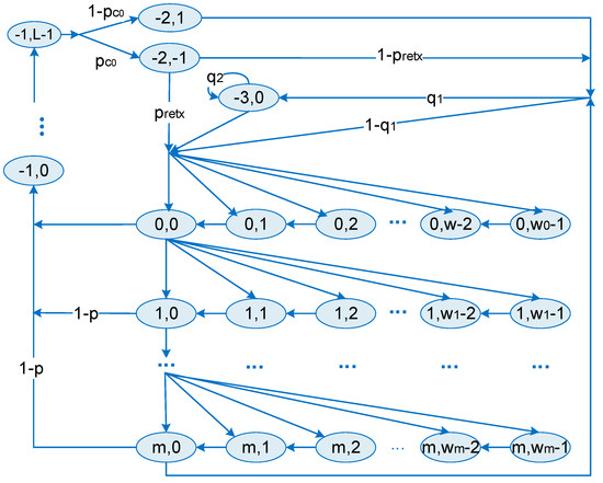As shown in Figure 11, the stochastic processes are divided into four states, backoff state (s(t) ≥ 0), transmission stage (s(t) = −1), and ACK state (s(t) = −2) and idle state (s(t) = −3). Then we obtain the backoff window length: