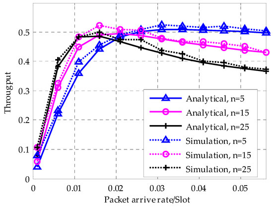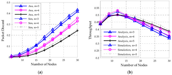The maximum number of retransmission (R) is set to 3. If a data frame has been retransmitted for 3 times, then it will be directly discarded. As shown in Figure 14a, it is clear that a lager m will effectively reduce the packet discard probability. A larger macMaxCSMA value indicates that more backoff processes are performed and it leads to a lower transmission failure rate. At the same time, as shown in Figure 14b, when the network has very few nodes, the network performs higher throughput with a smaller m. With the increase of the network scale, a larger m assists to relieve collisions and achieve higher network throughput. Since the packet discard probability and the throughput are influenced differently by the macMaxCSMA, both the network size and performances requirements should be considered when selecting a suitable macMaxCSMA value.