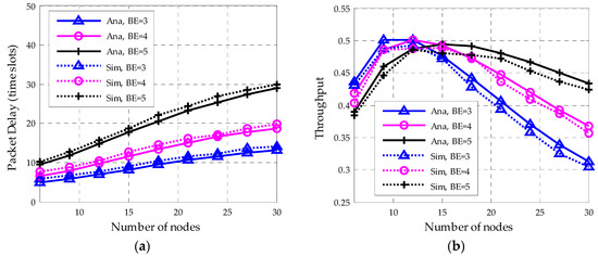 Figure 13a shows the variation of average packet delay with BE. The packet arrival rate is set to 0.01 per slot. With the growth of the network scale, the average packet delay increases too. Further, networks with smaller BE have better delay performance. However, as shown in Figure 13b, for a large-scale network, a lager BE relieves the collision and performs better in throughput. Therefore, when there are few nodes in the network, it is more appreciate to choose a small BE since the collisions happen in a low probability. In addition, a long backoff window will lead to unnecessary time consumption and jeopardize both the packet delay and network throughput. On the other hand, for a large-scale network, a long backoff window helps to relieve the collisions and achieves higher throughput.