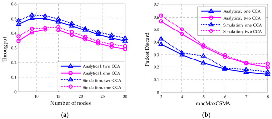 As shown in Figure 15a, the one CCA strategy adopted in this article obtains higher throughput than the standard two CCA strategies. Also, as shown in Figure 14b, when the nodes number is 25 and the packet arrive rate is set to 0.02 per slot, in both cases, with the increase of macMaxCSMA, the packet discard probability shows continuous decay. The proposed protocol also achieves a lower packet discard rate.