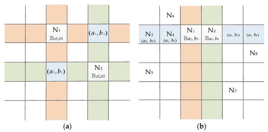 There are three cases on position relationship between two points in V. One is that, if points (a1, b1) and (a2, b2) in V lie on the different rows and columns, the two points should occur in blocks and , and then . Another is that, if points (a1, b1) and (a2, b2) lie on the same row and different column, the two points should occur in exactly the blocks whose subscript are expressed by other points on the same row except these two points, and then . The third is that, if points (a1, b1) and (a2, b2) lie on the same column and different row, the two points should occur in exactly the blocks whose subscript are expressed by other points on the same column except these two points, and then .