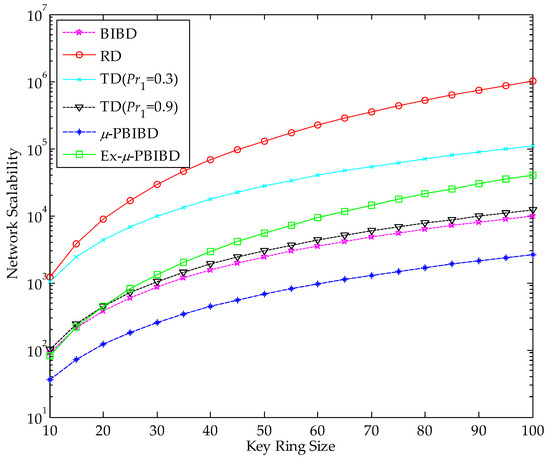 According to Table 3, we can obtain network scalability of these schemes. In sBIBD scheme, the key ring size was k = q + 1 and the maximum size of network supported by sBIBD scheme was q2 + q + 1. In RD scheme, the key ring size was k = q and the scalability of RD scheme was computed as (q2 + q + 1)(q + 1). In linear TD scheme, the key ring size was k and the probability that two sensor nodes shared a common key was Pr1. Then a prime q was chosen such that q + 1 ≤ k/Pr1, and the maximum scale of network supported by linear TD scheme was q2 [20]. In 2-D µ-PBIBD scheme, each node is preloaded with k = 2q − 2 distinct keys and the maximum network size that can be supported by 2-D µ-PBIBD scheme is q2. The key ring size is k = 3q − 3 in 3-D Ex-µ-PBIBD scheme which can support network size up to q3.