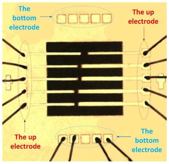 Large area PLZT AFE thick films were fabricated on silicon substrates by heterogeneous integrated manufacturing [23]. The wiring diagram of micro-cantilever is shown in Figure 1. The micro-system analyzer (MSV-400, POLYTEC, Waldbronn, Germany) shown in Figure 2a was adopted to test the vibration behavior of PLZT micro-cantilevers with a high-voltage amplifier (HA-400, PINTEK, New Taipei City, Taiwan). There were 10 gold-welded PLZT micro-cantilevers with conducting wires, and the other end of wires in Figure 2b were welded to the special encapsulation shell in the Printed Circuit Board.