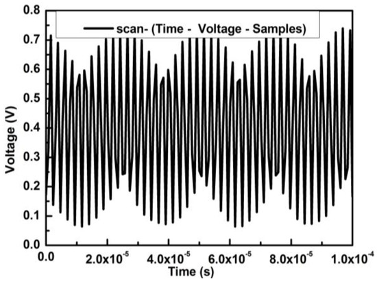 The linear frequency-modulated signal of MSA-400 was used for excitation with 1 V of both original amplitude voltage and offset voltage; thus, the sweep signal curve was plotted with time varying from 0 to 10−4 s in Figure 3.