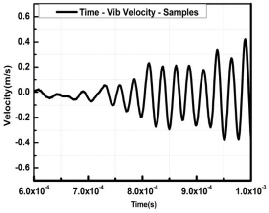 Figure 4 shows a Velocity-Time curve under the effective driving voltage signal of 20 V, where the single measuring point on the tip of micro-cantilever with 500 μm (L) × 40 μm (W) × 10 μm (H) was selected as the reference. The cantilever vibration under the chirp excitation is equivalent to the forced harmonic one, and thus, the resonant frequency equals the forced frequency. In this circumstance, the vibration period T is,