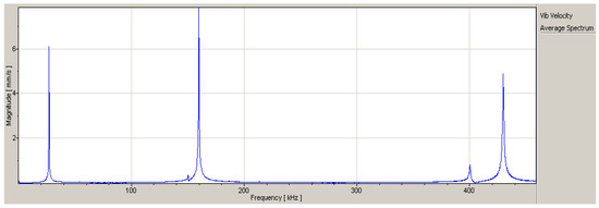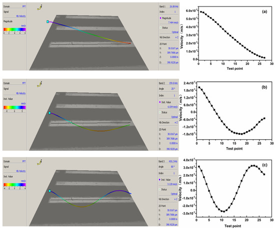 Firstly, there was a small peak near 400 kHz, but it was not usually regarded as the resonance frequency, because its velocity was far less than other resonance velocities. Secondly, Figure 7a–c displayed the velocity curves of resonance characteristics with 25 test points of the micro-cantilever at the first three order frequencies. The vibration velocity at the 2nd-order frequency was larger than that at the 1st order, yet the integrated displacement was smaller. In contrast, the vibration velocity and displacement at the 3rd-order frequency was contrary to those of the 2nd order.