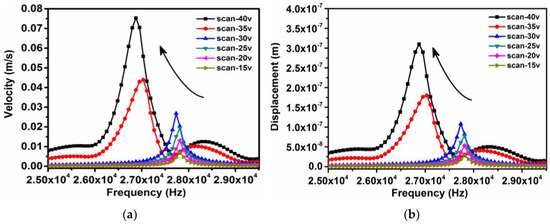 Resonance curves of micro-cantilever tip under different sweep voltages. (a) Displacement resonance curve, (b) Speed resonance curve.