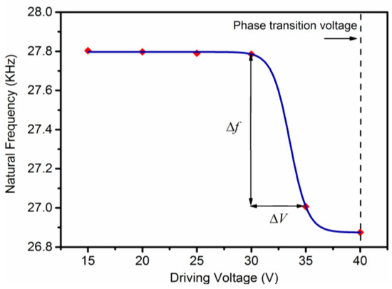 The micro-cantilever vibration results in frequency domain were plotted in Figure 8, when loading different amplitudes of excitation voltages, such as 15, 20, …, 40 V. There were different resonance peaks when sweeping the frequency from 0 to 100 kHz. As a result, two resonant intervals were clearly seen, and are shown in Figure 9. One interval was the steady resonant frequency of f1 ≈ 27.80 kHz under a driving voltage of less than 30 V, while the other was located in a small range of f2 ≈ 26.88~27.01 kHz when applying the driving voltage from 35 to 40 V. Figure 10 showed the relationship between the driving voltage and natural frequency, where the maximal frequency shift Δf and corresponding differential voltage ΔV before the phase transition could be read from the figure, Δf = 0.778 kHz and ΔV = 5V. Thus, the rate τ of frequency change to voltage change can defined as the factor by which frequency tuning ability may be measures: