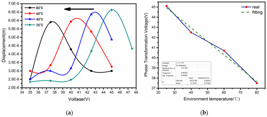 Relationship among displacement, phase transition voltage and temperature. (a) Displacement-Voltage curves, (b) Phase Transformation Voltage-Environment temperature curves.