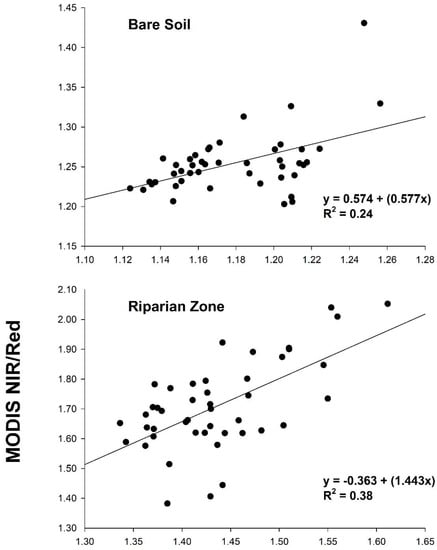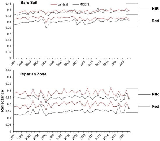 Because VIs are designed to respond to vegetation, it is not surprising we found lower correlations between MODIS and Landsat EVI over bare soil and sparsely-vegetated areas like the riparian zone (Figure 6) [44], where the soil color is the dominant driver of the red and NIR spectral response [9]. Based on NIR/red reflectance, soil likely contributed to increased variability and decreased correspondence between platforms, as correlations for NIR/red and EVI systemically increased with vegetation density (Figure 6 and Figure 8) [9,10,44]. Despite a stronger correlation between surface reflectance in the red wavelengths, the red bands displayed greater error rates compared to the NIR (Table 3). This is contrasted by [21], who found higher error with MODIS’ NIR band when compared to field-based measurements.