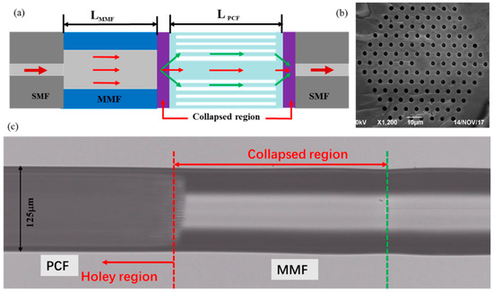 Figure 1a shows the schematic diagram of the MZI sensor. A section of MMF (MMF-IRVIS-50/125 μm-25-L, OZ Optics, Carp, ON, Canada) and PCF (LMA-10, NKT Photonics, Blokken, Denmark) was spliced between two SMFs (SMF-28e, Corning, Shanghai, China) by using a fiber cleaver and a fusion splicer (FSM 80s, Fujikura, Tokyo, Japan). The cladding of fibers were removed before splicing. The core/cladding diameter of MMF and PCF employed in experiment are 50/125 μm and 10.1/125 μm, respectively. The PCF consists of six layers of air holes as shown in Figure 1b. The splicing of SMF-MMF were used standard AUTO SM Mode in the splicer menu. The optimization conditions for splicing MMF-PCF and PCF-SMF were +60 Bit arc power, 380 ms fusion time and 20 μm overlap value. Under this condition, the air holes of the PCF are slightly tapered with a length of about 91 μm and the collapsed region was formed whose overall length is approximately 240 μm as shown in Figure 1c. The fusion technology might cause some variations in that collapsed region, which will affect the obtained spectra, which is inevitable. However, the whole fabrication process uses only cleaving and splicing, which can be well controlled by a commercial fiber splicer. Therefore, the repeatability of the process is relatively good compared with the CO2 or femtosecond laser manufacturing. When the light was transmitted into the MMF, a part of the power could be coupled into the cladding modes of the PCF at the MMF-PCF collapsed region due to the mode filed mismatch. At the PCF-SMF collapsed region, the part light in the PCF cladding mode would couple back into the core and produce interfere with the PCF core mode. Consequently, they were coupled into the fundamental mode of the right SMF. In order to trace the interference fringes, a C+L ASE source with a wavelength of 1528~1602 nm and an optical spectrum analyzer (OSA, Agilent 86142B, wavelength range from 600 nm to 1700 nm) with a resolution of 10 pm were connected to the ends of the SMFs during the manufacturing process.