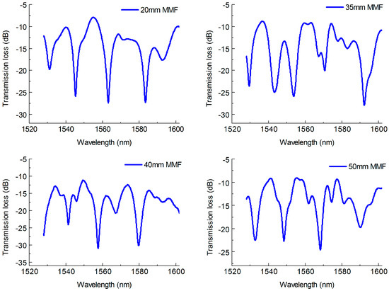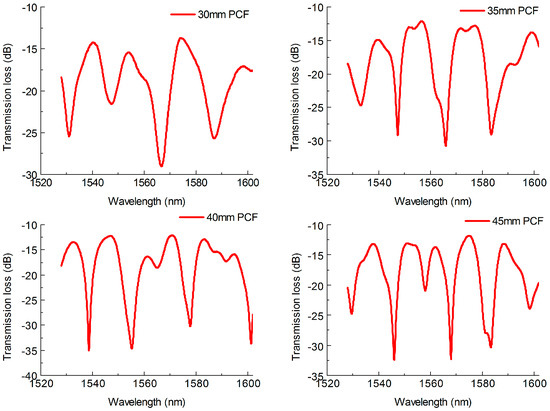 Figure 2 shows the transmission spectra of the MZI with different length of MMF. The length of PCF was set as 40 mm. It can be observed that some minor interference peaks appear as the length of MMF increases. This is mainly due to the length of MMF influencing the coupling strengths of the MMF core modes to the PCF cladding and core modes [32,33]. The multimode interference phenomenon is more obviously in the condition of longer length of MMF. In addition, the MZIs exhibited good fringe visibility, the max attenuation depth of the interference fringes for the four length of MZI were about 15 dB, 14.8 dB, 16.6 dB and 17.5 dB, respectively, as shown in Figure 2. The average values of the FSR for the corresponding MZI were about 20.7 nm, 17.1 nm, 16.6 nm and 15.9 nm, respectively, which shows a decreasing trend with the increase of the MMF length. In order to understand the influence of the PCF length to the MZI performance during our experiment, MZIs with PCF length of 30 mm, 35 mm, 40 mm and 45 mm were fabricated, and their transmission spectra are shown in Figure 3. The length of MMF was set as 30 mm. In Figure 3, it can be seen that the FSR of the MZI decrease as the length of PCF increases and the interference fringes are uniform but not look like those in Figure 2 with lots of multimode interference stripes. The average FSR of the MZI with MMF length of 30 mm, 35 mm, 40 mm and 45 mm were about 18.6 nm, 16.7 nm, 15.8 nm and 13.7 nm, respectively. Meanwhile, the MZI with different length of PCF also shown high fringe visibility, the max attenuation depth of which were about 17.2 dB, 20.3 dB, 19.9 dB and 24.1 dB, respectively, as illustrated in Figure 3. The max fringe visibility of our proposed MZI with SMPS fiber structure was higher than those of MZI with TCF-MMF-TCF structure (21 dB) [34] or MMF-TCSMF-MMF structure (14 dB) [35], MZI based on asymmetrical twin core fiber and multimode fiber (15 dB) [36] and some PCF interferometer structures, such as PCF-MZI with two waist-broadened tapers (11 dB) [37] or with up-tapered joints (11.5 dB) [38], normal PCF-MZI (21 dB) [28], TC-PCF MZI (10 dB) [16], TCF-PCF structure MZI (20 dB) [39] and S-tapered PCF (12 dB) [40]. In addition, it can be observed that the insertion loss of the proposed MZI is larger than that of MZI with SMF-PCF-SMF structure [8], which is due to the increase in the number of fusion. Moreover, the fusion parameters including arc power and arc time could be further optimized to decrease the insertion loss.