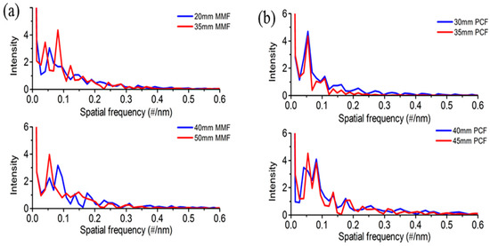 Spatial spectra of the MZI with different length of (a) MMF and (b) PCF.