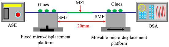 Figure 5 shows the experimental step for strain measurement. The proposed MZI was bonded on the two micro-displacement platforms using adhesive glues. The two micro-displacement platforms (GCM-127201AM, Daheng Optics, Beijing, China) with a min displacement resolution of 10 pm and max displacement of 20 mm were applied. One platform was fixed and the other could be movable. The distance between the two platforms was set as 200 mm as shown in Figure 5. During the experiment, we moved the right micro-displacement platform forward a distance of 10 μm every time. At the same time, the OSA and ASE were connected at the two ends of SMFs to record the transmission spectra change in real time.