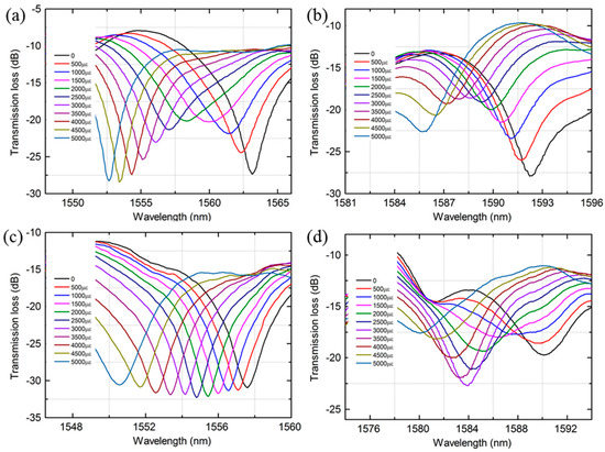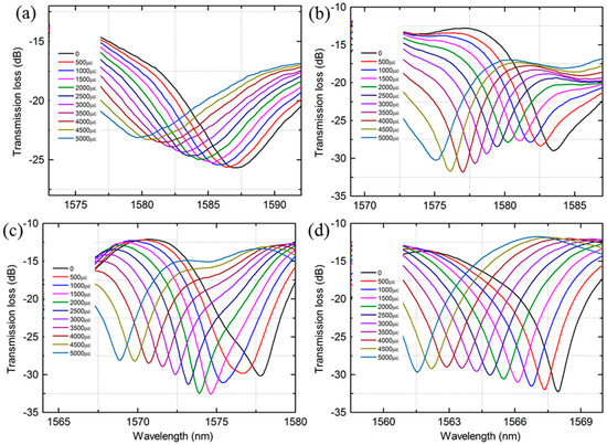 Figure 6 shows the transmission spectra change of the MZI with different length of MMF as the strain increases. It can be observed that the resonant wavelengths shift monotonically towards the shorter wavelength direction when the strain increases from 0 to 5000 με. The wavelength variation of the MZI with a length of 20 mm, 35 mm, 40 mm and 50 mm MMF were 10.46 nm, 6.44 nm, 6.99 nm and 9.99 nm, respectively, as shown in Figure 6. The corresponding wavelength response to the strain exhibited good linearity, characterized by similar strain sensitivities: −2.21 pm/με, −1.28 pm/με, −1.36 pm/με and −1.88 pm/με for the four peaks, respectively, as shown in Figure 7a. Furthermore, the dependence of the strain sensitivity and the length of PCF were also investigated as illustrated in Figure 7b. The resonant wavelength of the MZI with a length of 30 mm, 35 mm, 40 mm and 45 mm PCF had a blue shift and the wavelength drift were 7.04 nm, 8.35 nm, 8.91 nm and 6.44 nm, respectively. The linear fitted plots to wavelength shift versus strain of four length of PCF are shown in Figure 7b. The strain sensitivity of the MZI with four length of PCF were −1.43 pm/με, −1.64 pm/με, −1.71 pm/με and −1.29 pm/με, respectively. The R2 of the fitted lines for the corresponding MZI were 0.9911, 0.9984, 0.9961 and 0.9993, respectively. From the above investigation, it can be seen that the length of MMF or PCF does not strong influence on the strain sensitivity. This means that strain sensitivities of the MZI are weekly depend on the length of MMF or PCF. In addition, the transmission loss of the MZI change as the strain increases is not uniform as shown in Figure 6 and Figure 8. For instance, the transmission loss of the 1563 nm dip and the 1592 nm dip were first increased slowly and then gradually decreased as shown in Figure 6a,b whereas that of the 1558 nm dip and 1587 nm dip were almost kept unchanged as shown in Figure 6c and Figure 8a, respectively. As the applied strain varies, the spliced points will be stretched along the fiber, which could cause the light intensity change in the collapsed region, the transmission loss would change as well.