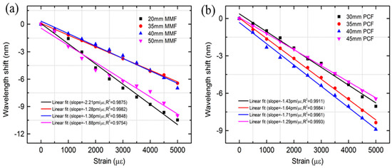 Wavelength shift of the MZI with different length of (a) MMF and (b) PCF as a function of strain.