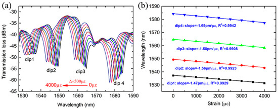 (a) Transmission spectra change of the MZI with SPS structure as the strain increases (b) Wavelength shift of the four dips as a function of strain.