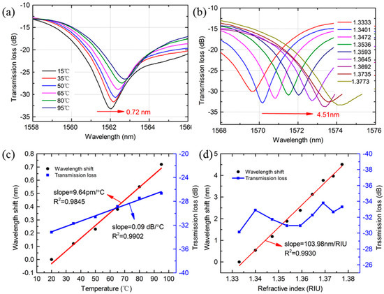 (a,b) Transmission spectra change of the MZI as the temperature or RIs change, respectively; (c,d) Wavelength shift and transmission loss of the MZI as a function of temperature or RIs, respectively. (MZI with 20 mm MMF and 40 mm PCF).