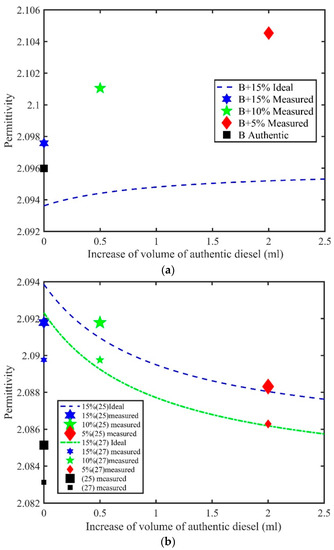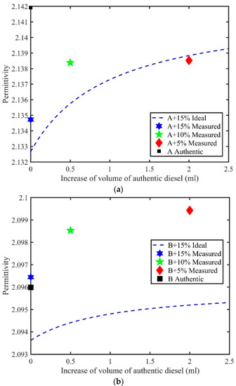 For more clarity, we started with the assumption that we had a relatively highly adulterated sample. As an example, let us start with an initial condition that is diesel oil adulterated by 15% of kerosene. For this sample, in the beginning, V’ = 0, because no volume of authentic diesel has been added yet. Hence, VD = 0.85 V, where V = VD + VK. In the dilution process, we next assume that after adding a certain volume of authentic diesel (V’) into the initial sample (diesel sample adulterated by 15% kerosene), the total volume of pure diesel in the mixture increases, while the volume of kerosene remains the same; thus, we assume that this corresponds to 10% adulteration. This means that, in Equation (4), the volume fraction of the diesel oil becomes fD = (0.85 V + V’)/(V + V’) = 0.9. Using this equation, we solve for V’ and get V’ = 0.5 V. Hence, the total volume of the 10% adulterated sample at this stage is 1.5 V. Furthermore, this 10% sample is next diluted to 5% which gives V’ = 2.0 V. Using the measured refractive index data of authentic diesel oil and kerosene and by calculating εideal we can freely choose V ’ and plot the resulting ideal permittivity of the binary mixture as a function of V’. For the case of experimental data, we get three discrete permittivity points at V’ = 0, 0.5 and 2.0 in a graphical presentation. The ideal permittivity as a continuous function of V’ can be calculated using Equation (2) and the refractive index values can be measured from authentic diesel oil and kerosene. Using such data, the excess permittivity can be assessed.