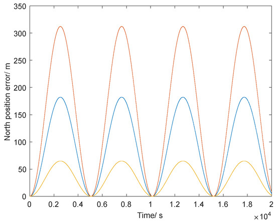 Here we calculate the north position error caused by three typical values of north–south gravity vertical deflection as an example to better represent the influence of gravity disturbance on INS. And the simulation results are shown in Table 1 and Figure 3.