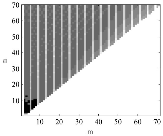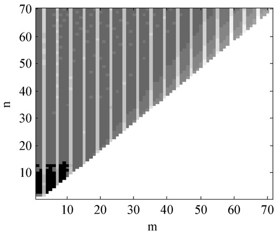 In Figure 4 and Figure 5, horizontal ordinate (m) and longitudinal coordinate (n) represent the number of degrees of the EGM2008. In these two figures, the darker place means the greater value of logarithms of and . From these two figures, we could see that the values of the covariance are mainly focused below 12 degrees, which indicates the value of gravity mainly focuses on the SHM’s lower degree. Thus, in this paper, we set the maximum order of the simplified SHM as to calculate the normal gravity.
