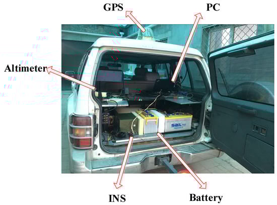 To prove the effectiveness and feasibility of the combined gravity compensation method in INS, two vehicle tests were applied in the city of Xi’an in China and denoted as test 1 and test 2. Test 1 and test 2 were applied in the areas with flat terrain and complex terrain respectively. On the test vehicle, an altimeter, a GPS receiver, a set of batteries, a high-precision INS, and a data processing computer (PC) were carried. The high-precision INS and the batteries were fixed on the overplate at the trunk. The computer was used to collect the data of GPS and INS in real time, then the data was resolved for navigation. The test vehicle is shown in Figure 7. The accuracy of the inertial sensors and GPS are listed in Table 2.