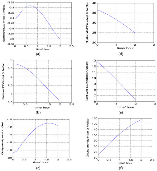 The gravity anomaly and DOVs of two tests. (a) South-north DOV in test 1; (b) East-west DOV in test 1; (c) Gravity anomaly in test 1; (d) South-north DOV in test 2; (e) East-west DOV in test 2; (f) Gravity anomaly in test 2.