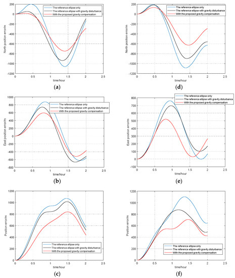 From Figure 9, we can see that the values of DOVs and gravity anomaly in the area of test 1 are both larger than that of test 2. To better prove the effectiveness and accuracy of the combined gravity compensation method, the maximum position errors were used to prove this. Here we regarded the position result of GPS as the true value, and respectively compared it with the position results compensated with three different gravity compensation methods: 1 only with the reference ellipse (shown as blue colour); 2 with the reference ellipse and gravity disturbance (shown as black colour); 3 with the proposed compensation method (shown as red colour).The position error results are shown in Figure 10, in which (a), (b), (c) are the position results of test 1; (d), (e), (f) are the position results of test 2.