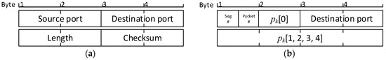 The structure of the modified UDP packet is presented in Figure 2 and based on the concept of covert channel micro-protocols. Only the destination port field is left untouched from the original UDP packet header [35]. The second byte of the source port, packet length, and checksum fields is used to store five bytes of authentication data. The first byte of the source port is divided into two 4-bit nibbles. The first nibble is used to store segment number , and the second nibble stores the sequential number of the packet in the current segment.